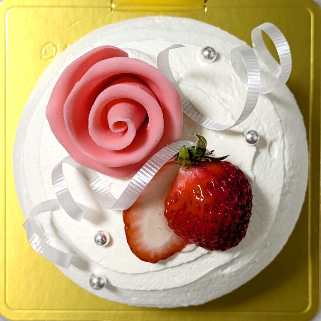 手作りのバラを飾った華やかなドーム型ケーキは、苺のサンド入りで見た目も味わいも特別。